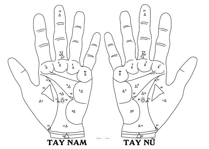 - Hai hình tam giác đối đầu liền nhau, ở đốt 3 ngón giữa; hạnh phúc và của cải do nhiều lần đi du lịch. Nếu chỉ có một hình tam giác thì lại là người hung hãn, dễ bị lôi cuốn.
